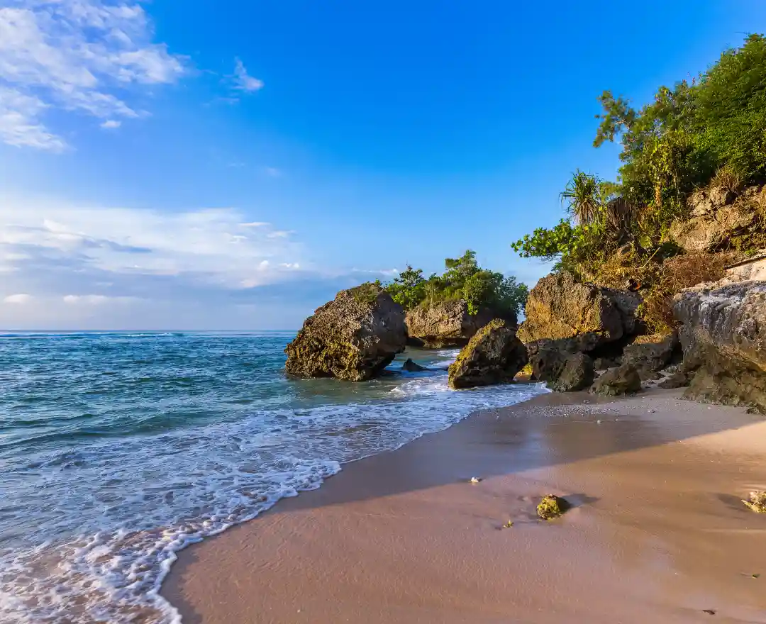 Padang Padang Beach in Bali is a tropical paradise that beckons with its golden sands, crystal-clear waters, and world-renowned surf breaks. Nestled between towering limestone cliffs, this beach offers a unique and picturesque setting for sunbathing and swimming. The dramatic rock formations provide natural shade and create a tranquil atmosphere, making it an ideal spot for relaxation.
